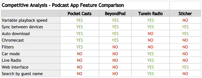 Using the same 4 podcast apps from the task analysis, I conducted a competitive feature analysis. It was important that I became aware of the capabilities of the best podcast apps and how they differentiated themselves from one another.