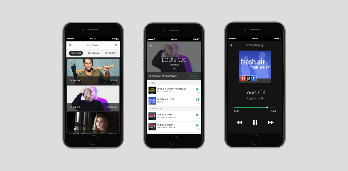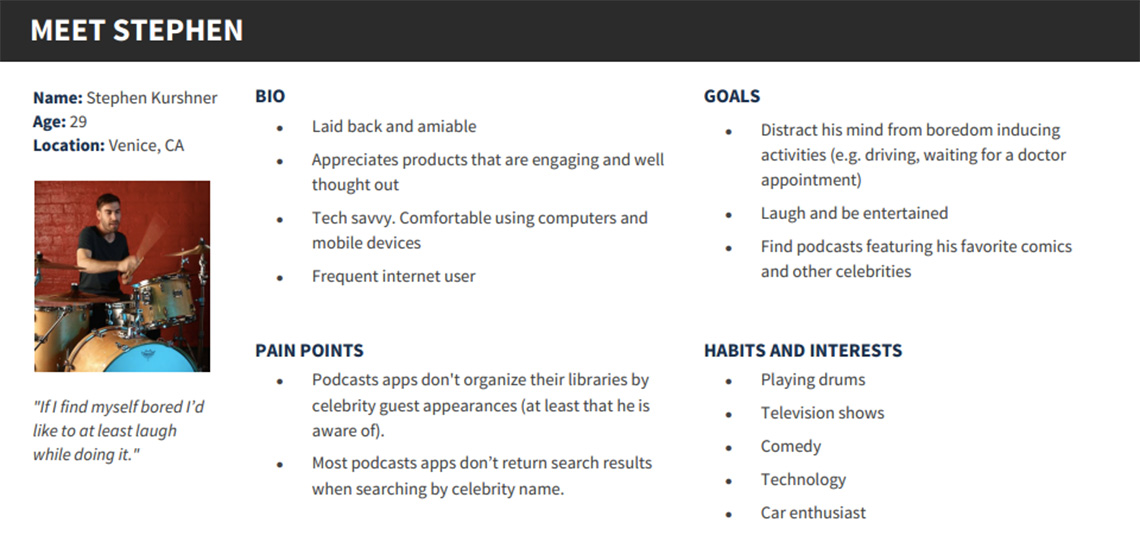 When I first met with Stephen my primary goal was to understand his interests, habits and daily routine. By doing so I hoped to uncover an unmet need that I could fulfill. A number of interesting pain points surfaced, but I found Stephen’s desire to follow his favorite comedians’ podcast appearances to be the promising. Thus I decided to make a mobile podcast app called Podparazzi.