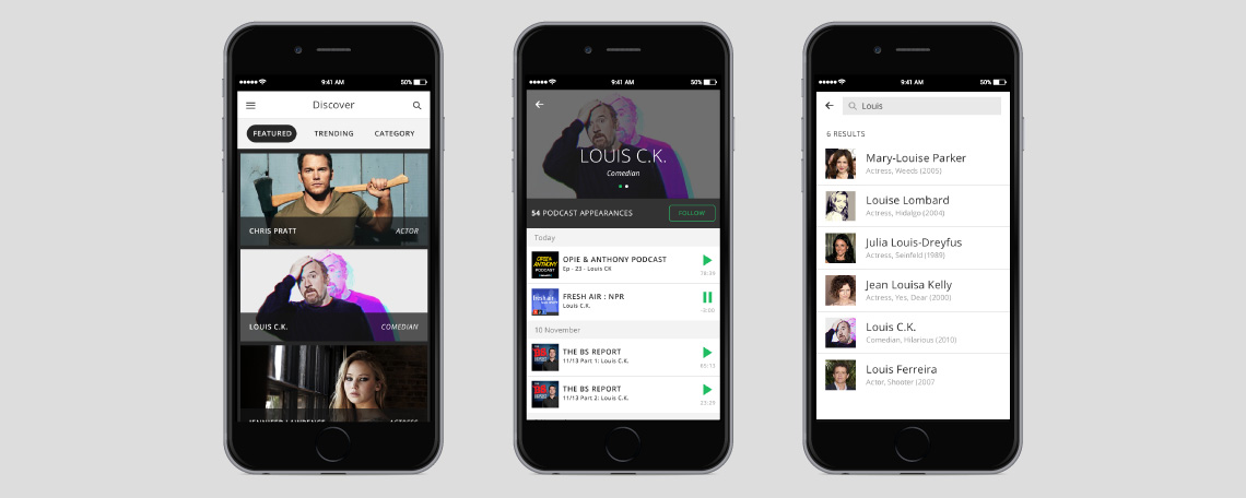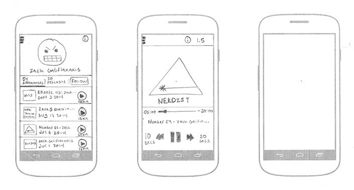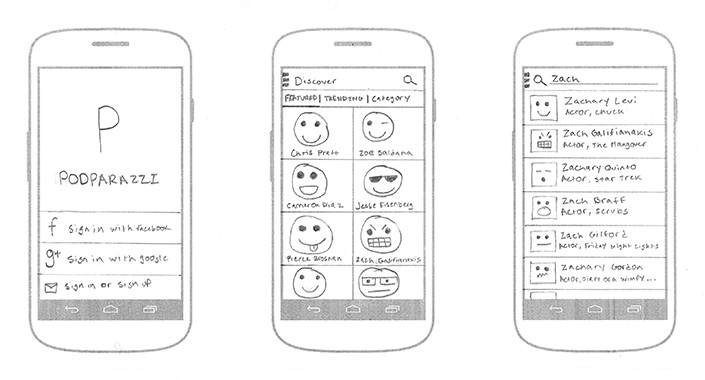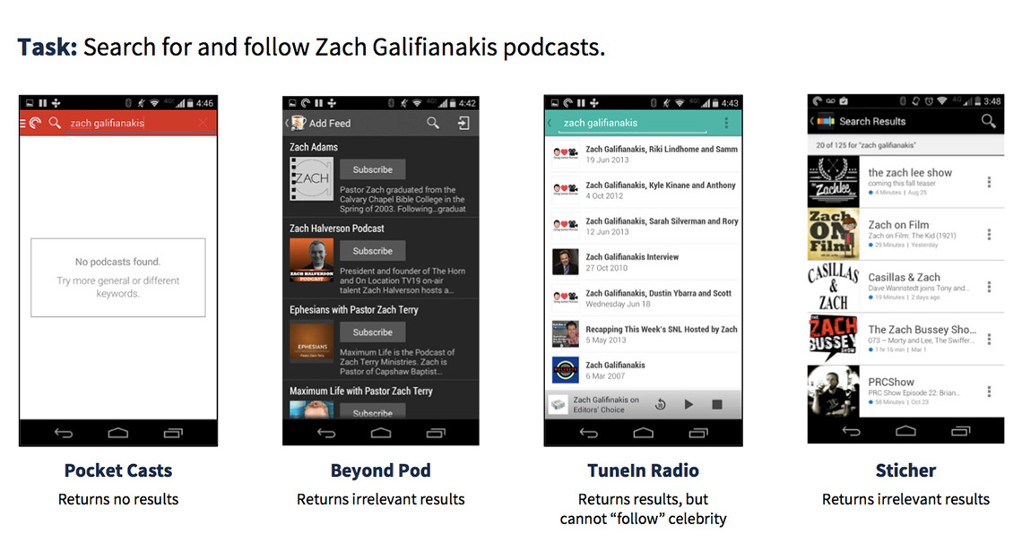 I understood Stephen’s desire to follow celebrity podcasts, but I also needed to understand the extent to which this functionality existed in an already crowded podcast marketplace. I selected 4 of the most popular podcast apps and attempted to find and follow Zach Galifianakis podcasts. The results were underwhelming, but validated the Podparazzi concept.