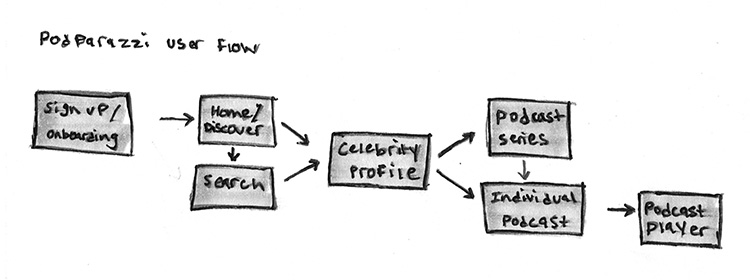 A hand drawn user flow helped me map out the individual sections of Podparazzi MVP and the ways by which Stephen could move/navigate through them.