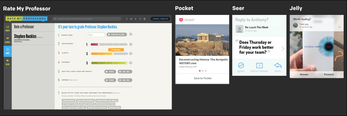 I collected a number of well designed mobile and desktop patterns that related to either the process of rating something or taking action on a bit sized piece of information. These patterns served as inspiration for the design phase.