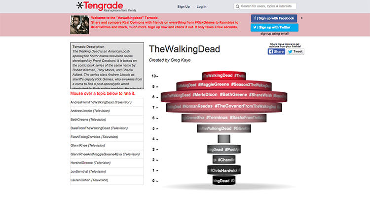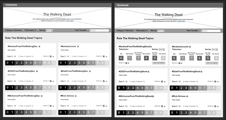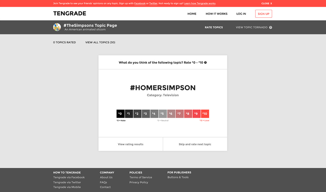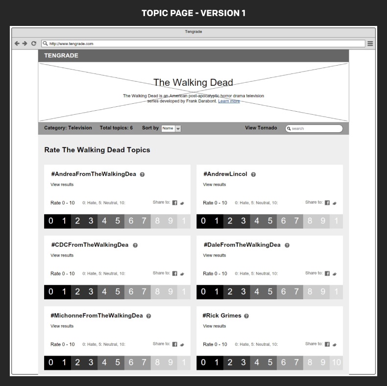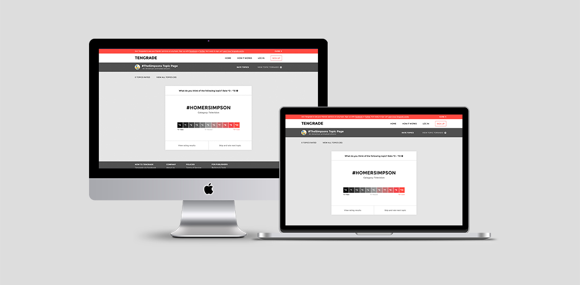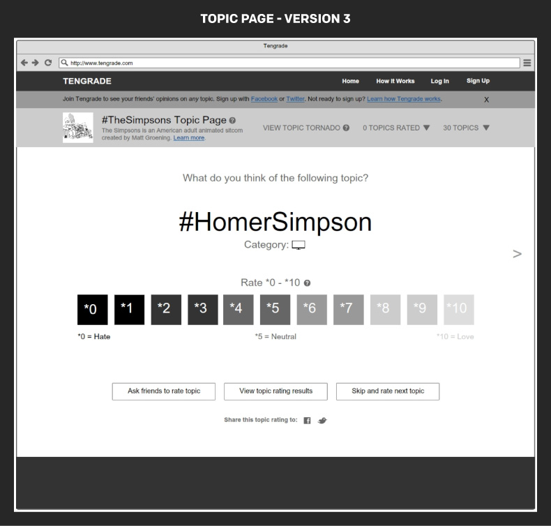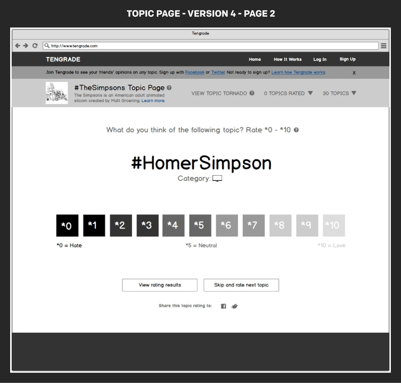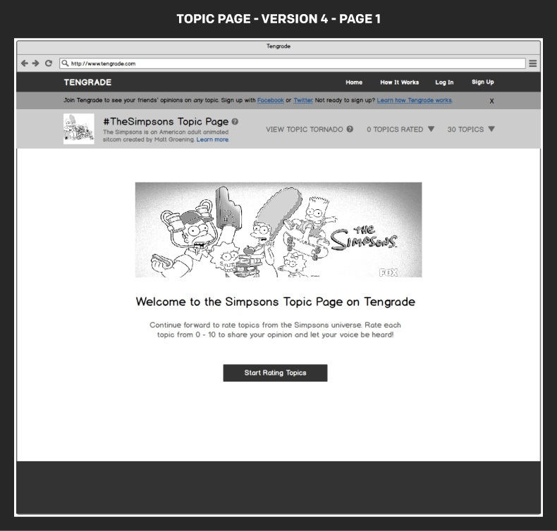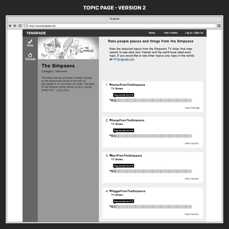 Tengrade is a web application that allows users to give and get opinions on any topic. I along with my teammates, Amir and Janet, worked with Ted Werth, a Tengrade cofounder, to improve the usability and conversion rate of one of Tengrade’s most frequently visited sections: Topic Pages. Topic pages group many related topics together under a parent topic, e.g. The Simpsons. Individual topics are rated from 0 to 10.