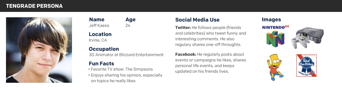 Using the information we gathered from our stakeholder interview and our own individual research, we created a persona named Jeff to remind us of our primary user’s affinities and social media use.