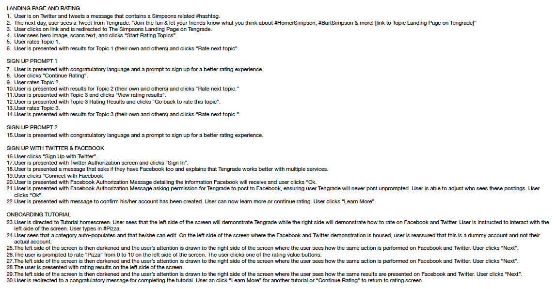 A detailed user flow listed each of the pages and actions Jeff would take as navigated through the topic rating, sign up and onboarding sections.